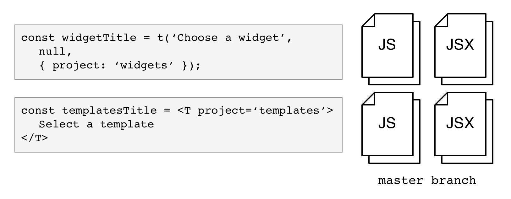 Alternatively, the same string in a React/.jsx file would utilize our <T>