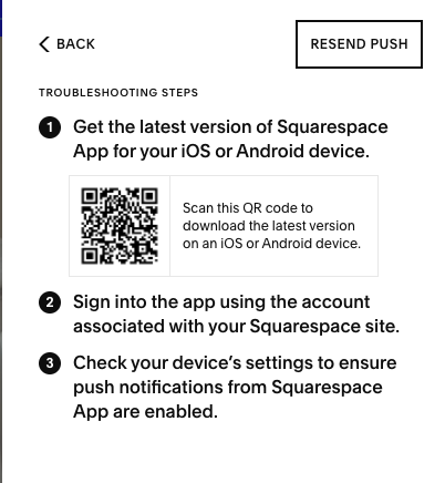 What if the user doesn’t receive a push notification? There could be several reasons for that; maybe they have disabled notifications or the Squarespace app is not installed. For these cases, we created a troubleshooting menu to help our users.